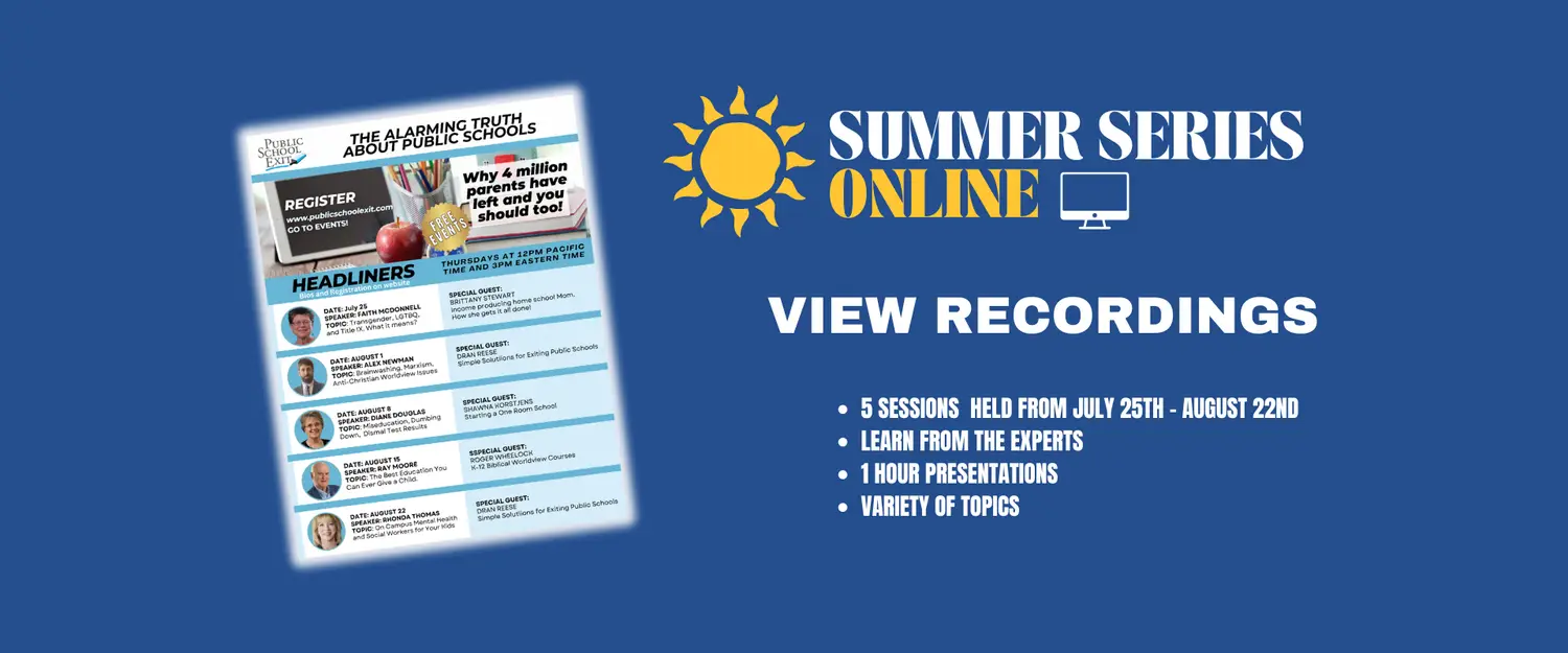 Our team of experts will discuss the reasons parents and churches are getting their children out of public schools. Each session features a guest speaker and on topics including Transgender, LGBTQ, Title IX, Brainwashing, Marxism, Anti-Christian Worldviews, Miseducation, Dumbing Down, Dismal Test Results, Campus Mental Health, Social Workers for Your Kids, K-12 Biblical Worldview Courses, Starting a One Room School, Simple Solutions for Exiting From Public Schools and so much more…